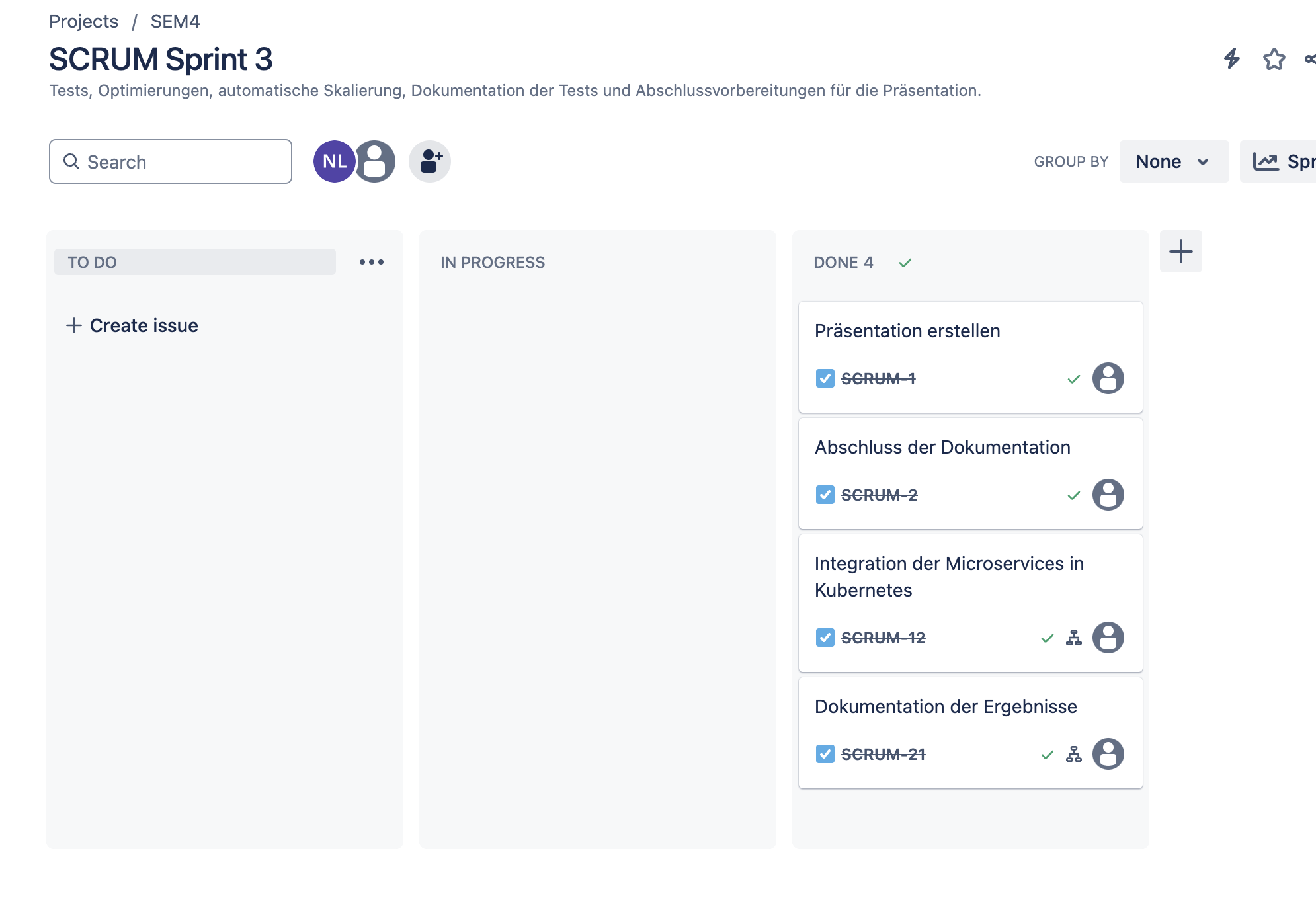 Der dritte Sprint markierte den erfolgreichen Abschluss der gesamten Semesterarbeit. Der Fokus lag auf der Durchführung von Tests, der Optimierung des Systems, der Implementierung der automatischen Skalierung sowie der Fertigstellung der Dokumentation und der Präsentation. Trotz einiger unerwarteter Herausforderungen konnten alle Projektziele erreicht werden.